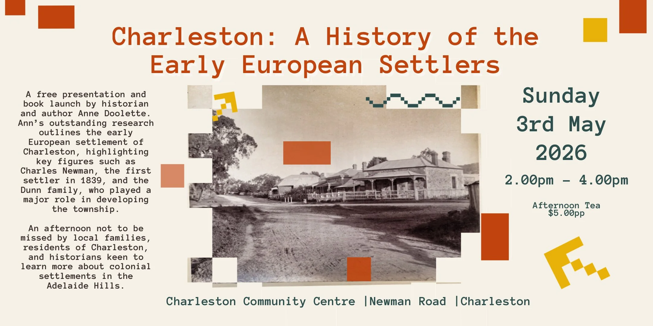 Charleston: A History of the Early European Settlers. 3rd May 2-4pm You’re invited to join historian and author Ann Doolette for an informative afternoon about the settling of Charleston. Great for locals to find out about the families who still live and work in the area, and for those history buffs wanting to learn more about early settlement in the Adelaide Hills. Afternoon Tea $5.00pp. Bookings appreciated: Eventbrite QR